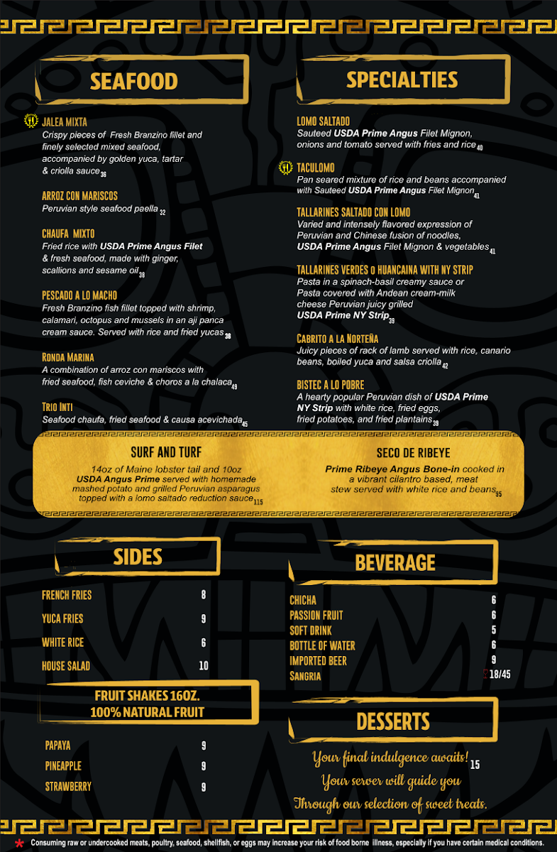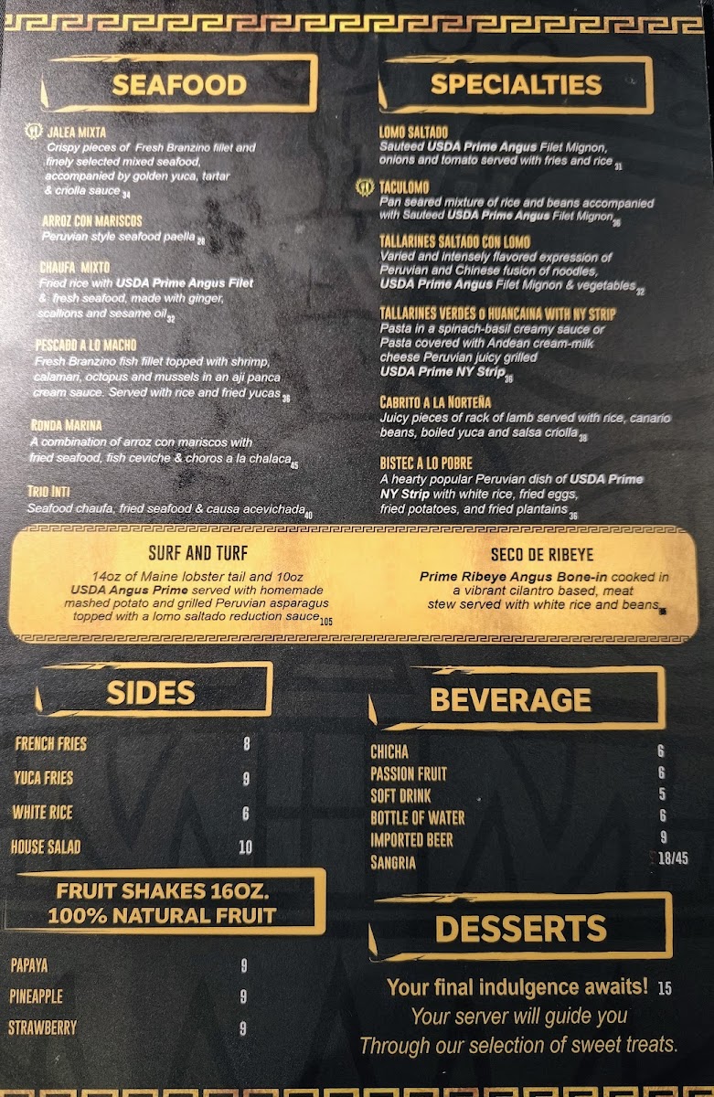 14oz of Maine lobster tail and 10oz USDA Angus Prime served with homemade mashed potato and grilled Peruvian asparagus topped with a lomo saltado reduction sauce