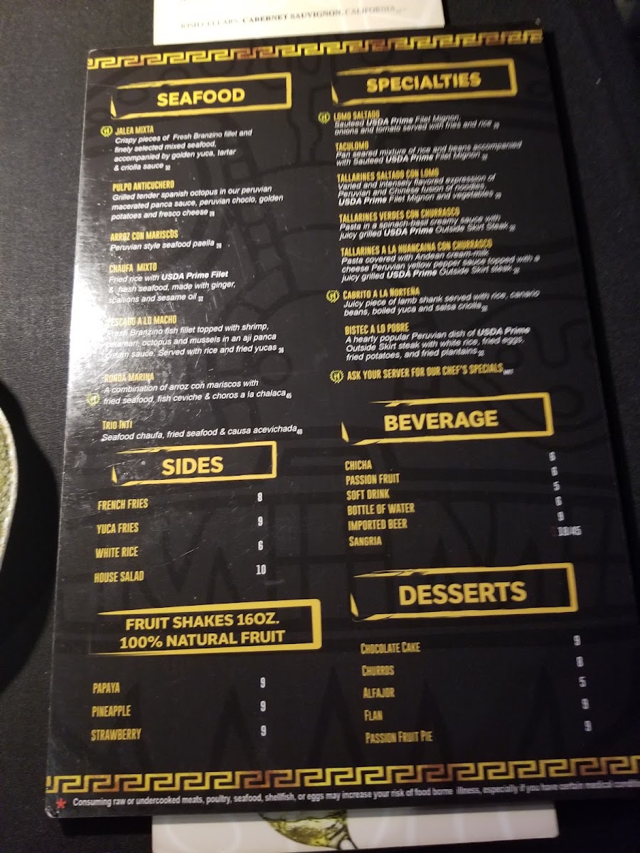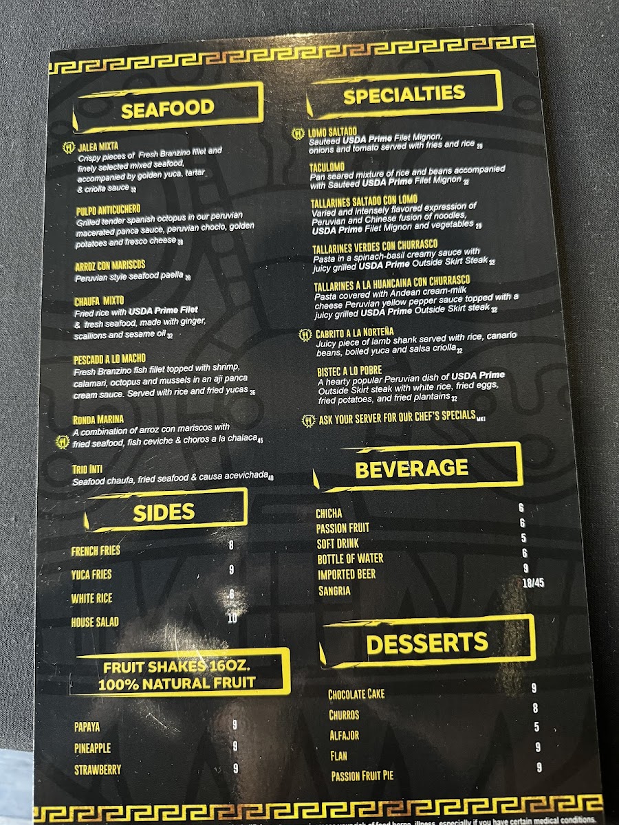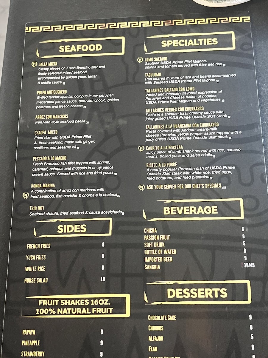 Fresh Branzino fish fillet topped with shrimp, calamari, octopus and mussels in an aji panca cream sauce. Served with rice and fried yucas